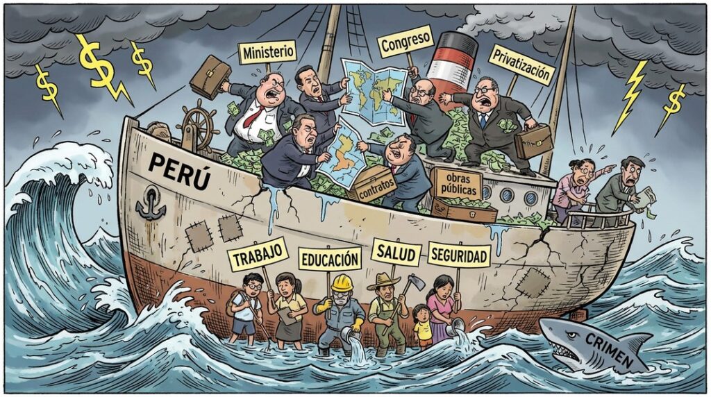 Корупција је друштвени рак који је метастазирао на свим нивоима националне власти и државних институција. Ова пошаст се снажно развила током владавине бившег председника Фухиморија, а данас постоје криминалне организације које из самог врха власти пљачкају перуанску државу.