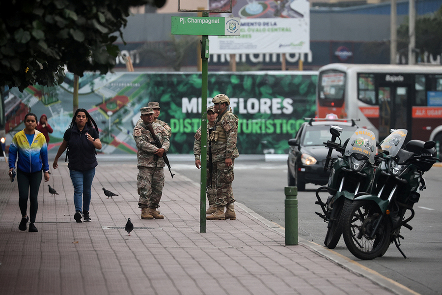 Људи пролазе поред припадника војске, након што је председник Перуа Хосе Џери прогласио 30-дневно ванредно стање у главном граду и суседној провинцији Каљао како би се борио против пораста криминала, у Лими, Перу, 22. октобра 2025. REUTERS/Sebastian Castaneda